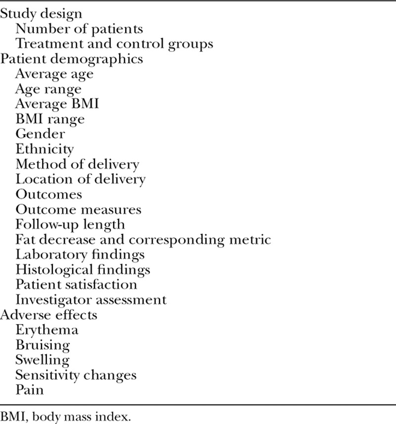 A systematic review of the MEDLINE and Cochrane databases was performed with the search algorithm cryolipolysis OR cool sculpting OR fat freezing OR lipocryolysis. Two investigators independently reviewed article titles and abstracts to identify studies that assessed outcomes of cryolipolysis. Selected articles that met these inclusion criteria then underwent full article review by the two investigators. Additional articles were then identified by manual review of the references of the articles that were initially identified via the primary search. Review papers and animal studies were eliminated. A third investigator reconciled disagreements. The Cohen Kappa coefficient was calculated to demonstrate the level of agreement between the two initial investigators. The same two investigators performed data extraction independently, and any discrepancies were again reconciled by the third. Table 1 lists the information extracted from each article.