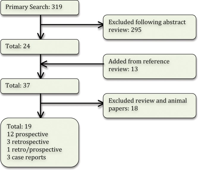 The primary literature search returned 319 articles (Fig. 1). The references of articles identified in the primary search were reviewed, yielding a total of 37 articles. Review papers and animal studies were eliminated, yielding a final number of 19 articles, including 12 prospective studies, three retrospective studies, one study with both prospective and retrospective groups, and three case reports. The Kappa coefficient was calculated at 0.885, indicating very good agreement between the investigators.