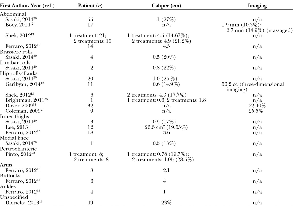 Table 2. Reported Reduction in Caliper and Imaging Measurements after Cryolipolysis, Organized by Location