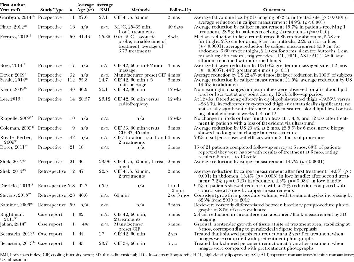 The primary literature search returned 319 articles. After inclusion criteria were applied and additional articles were idenfied via manual review of article references, 19 studies were selected for review. Average reduction in caliper measurement ranged from 14.67 percent to 28.5 percent. Average reduction by ultrasound ranged from 10.3 percent to 25.5 percent. No significant impact on lipid levels or liver function tests after cryolipolysis treatments was noted in any study. Only mild, short-term side effects, such as erythema, swelling, and pain, were noted. Paradoxical adipose hyperplasia was described in one patient.